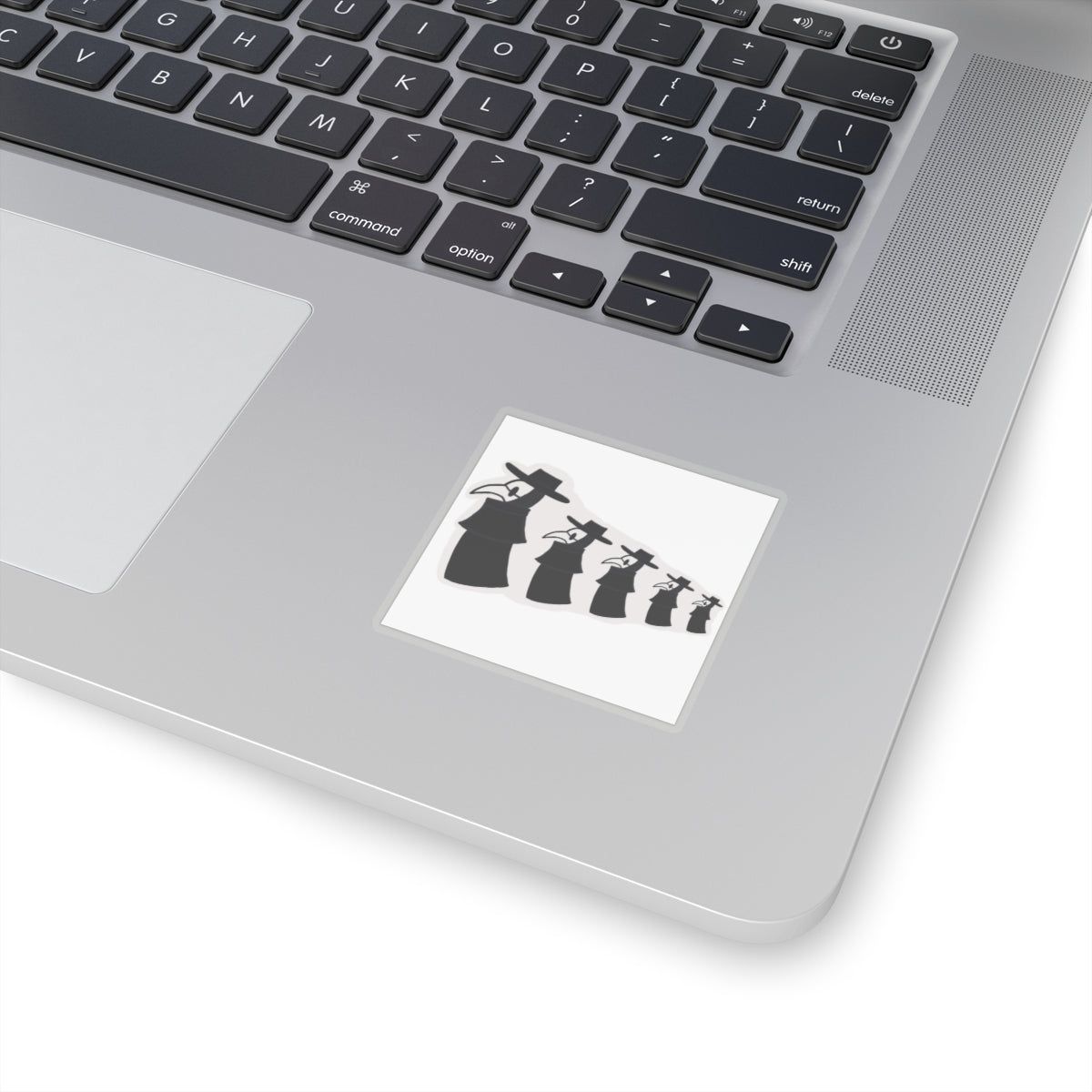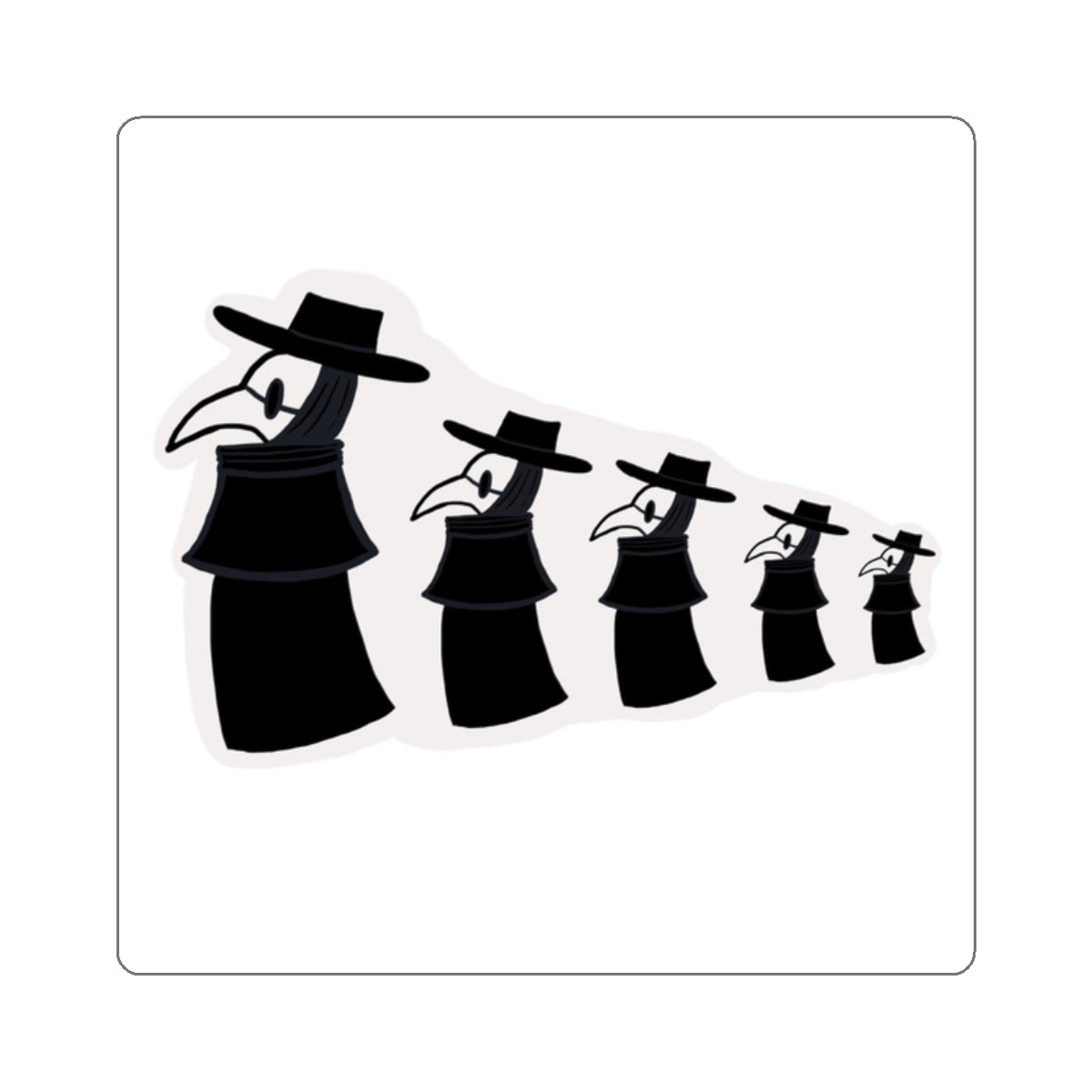 Share your passion for art with our Plague Doctors hanging off a cliff kiss-cut stick. This design was hand-drawn by a local artist and features a beautiful design feature a duckling like row of plague doctors.