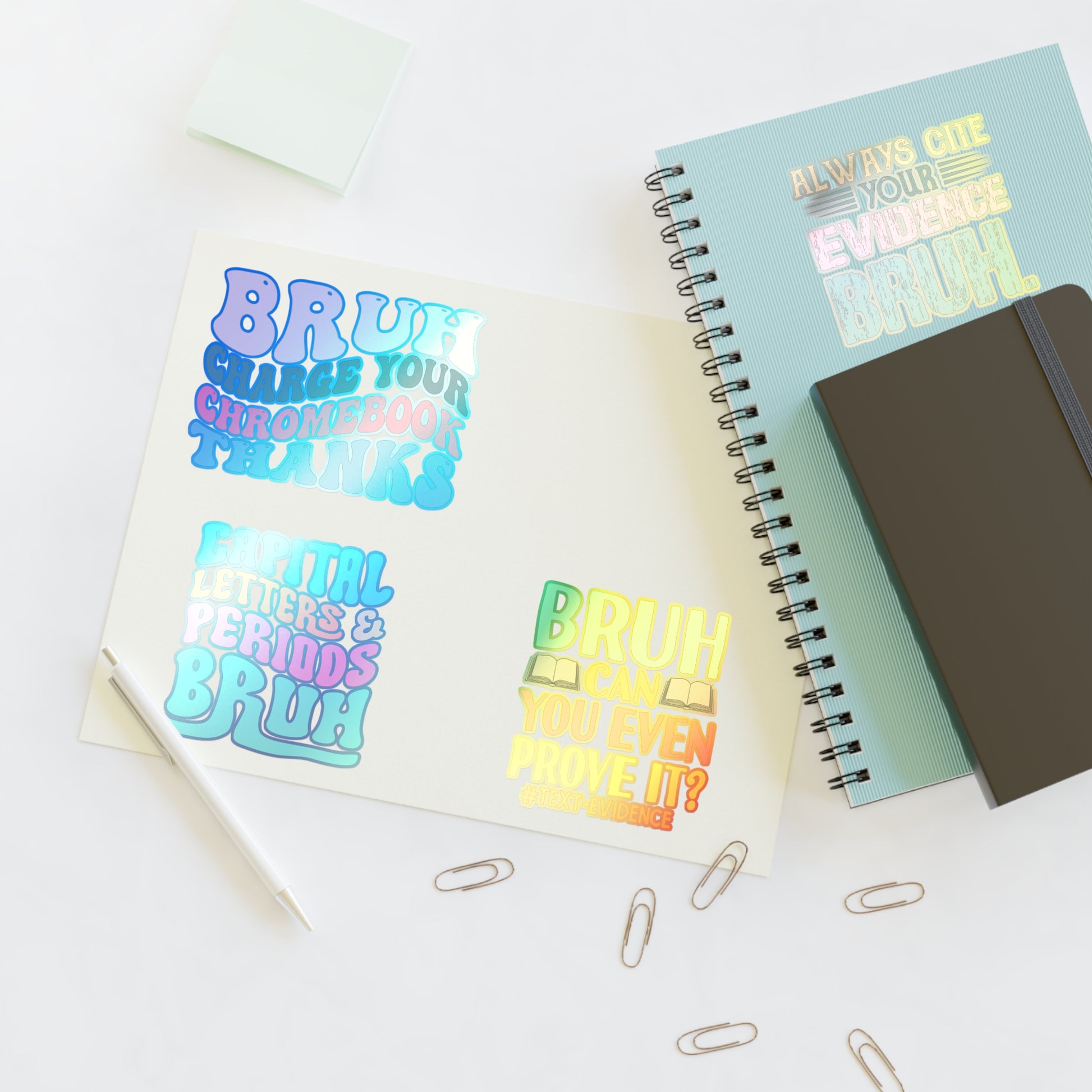 Our humurous Teacher Bruh stickers are a great addition to your classroom. This set of 4 vibrant stickers send positive messages through a relatable means and are a must have for your classroom. Available in white, holographic, and transparent versions to choose from.